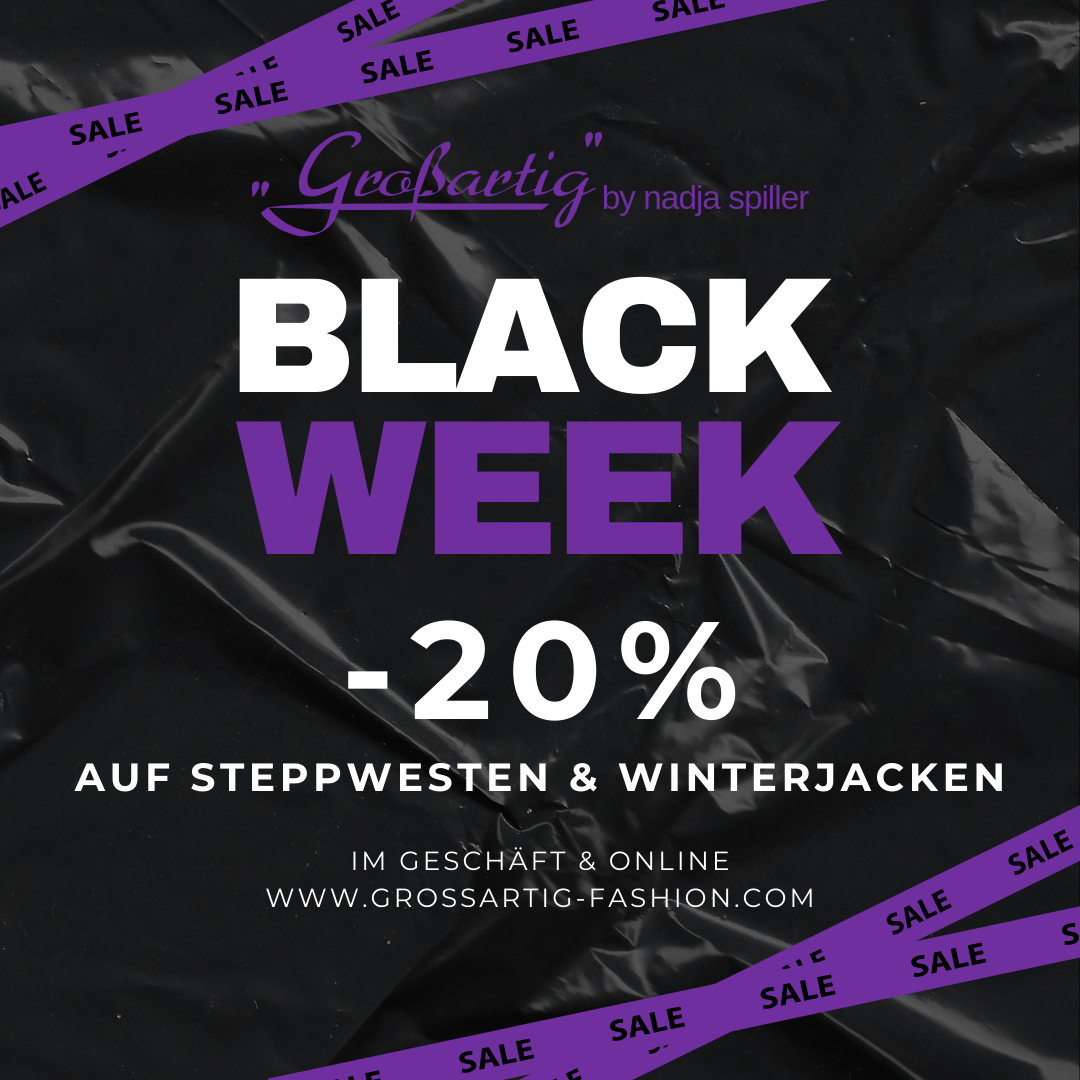 Es ist BLACK WEEK bei Großartig🥳 spare jetzt & sichere dir -20% Rabatt auf Steppwesten & Winterjacken🤗