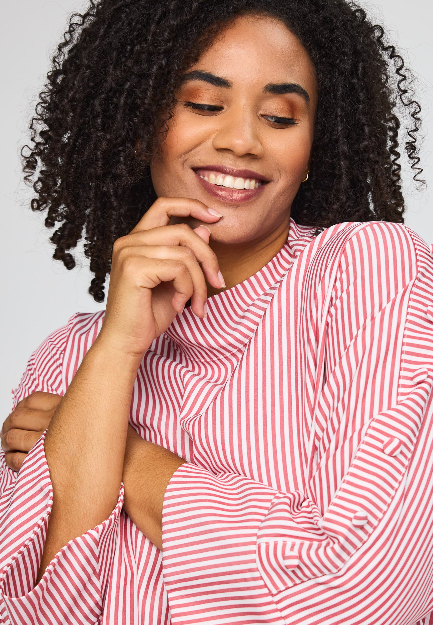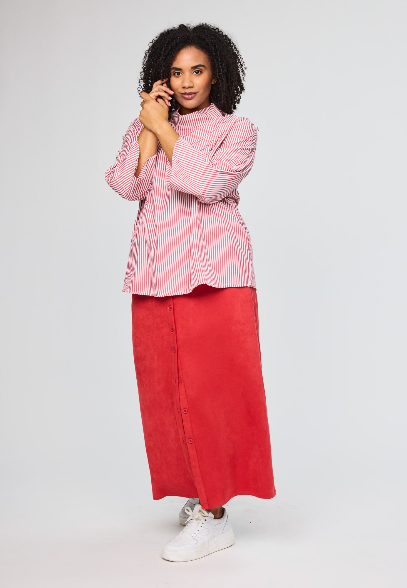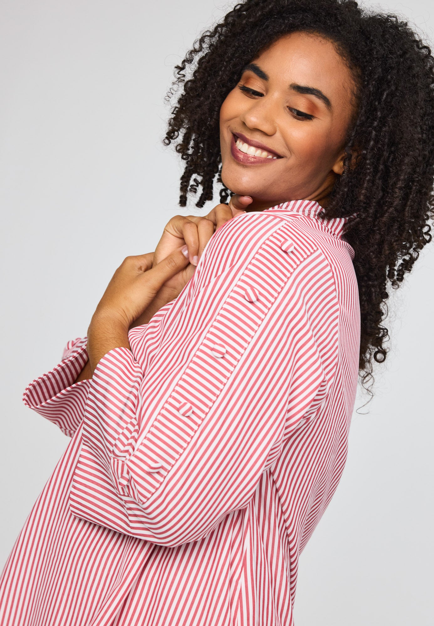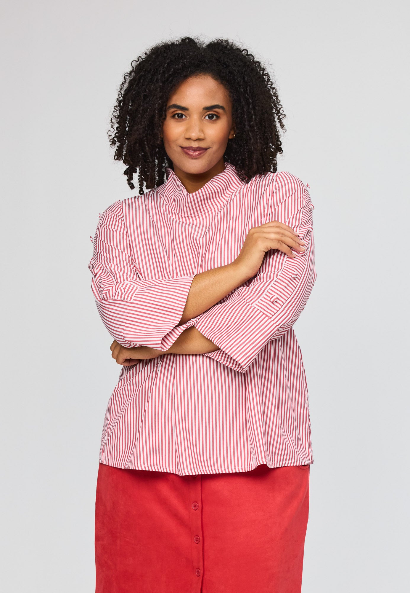 Wunderbare gestreifte Bluse von Studio mit tollen Details an den Dreiviertellangen Ärmeln. Die kleinen Boller setzen charmante Akzente und verleihen der Bluse einen besonderen Charakter. Ein vielseitiges Piece für deinen Alltag, das Stil und Persönlichkeit ausstrahlt.
