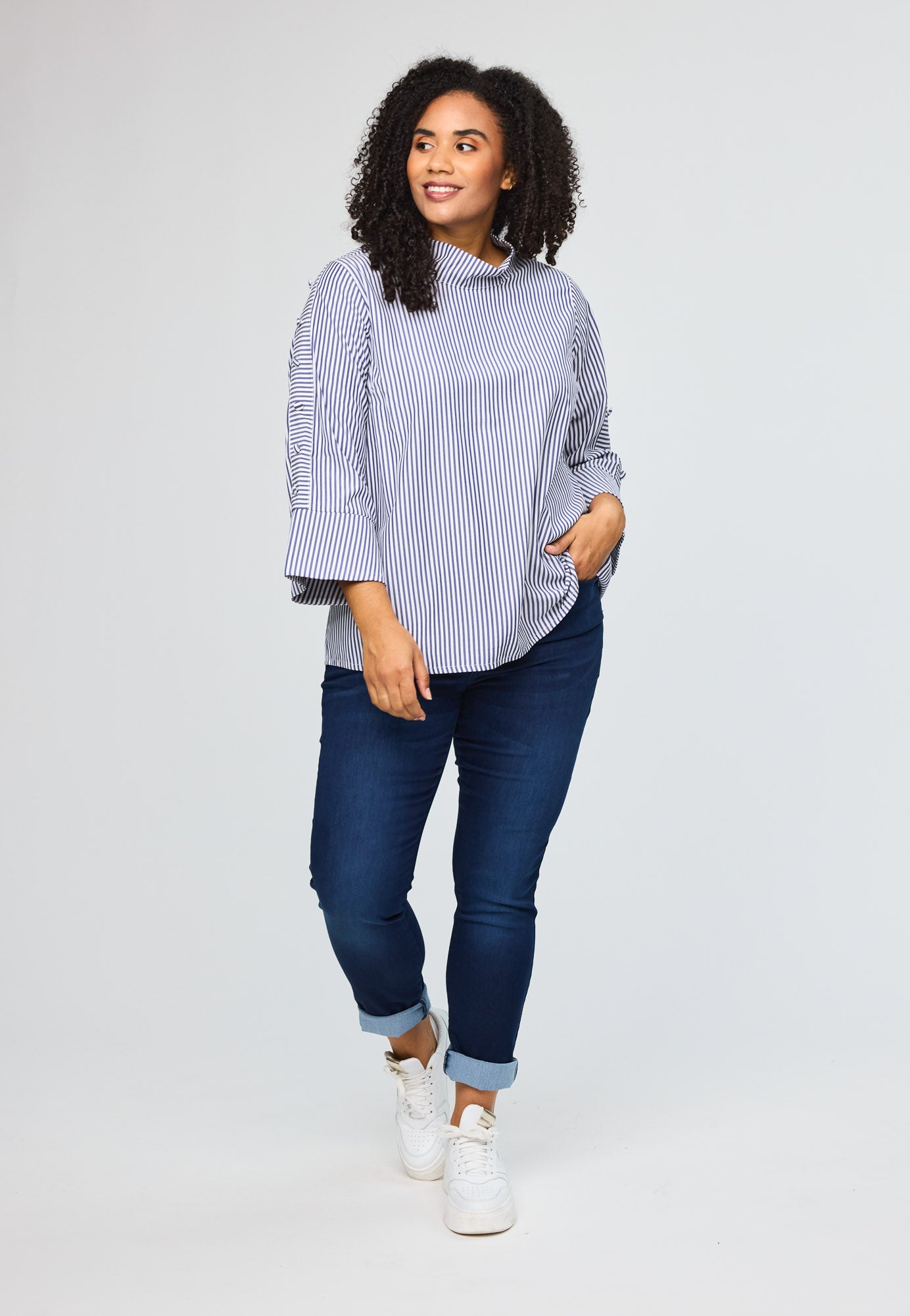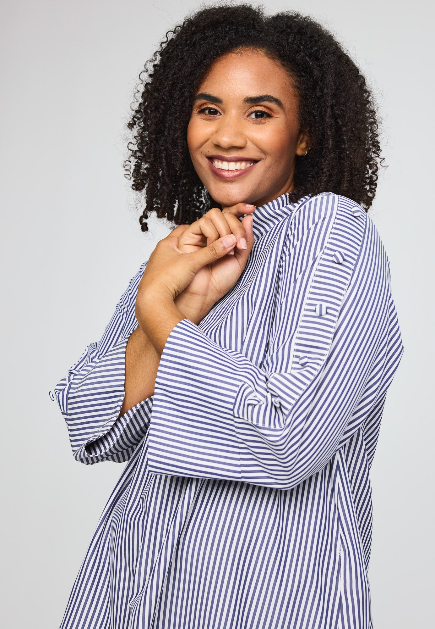 Wunderbare gestreifte Bluse von Studio mit tollen Details an den Dreiviertellangen Ärmeln. Die kleinen Boller setzen charmante Akzente und verleihen der Bluse einen besonderen Charakter. Ein vielseitiges Piece für deinen Alltag, das Stil und Persönlichkeit ausstrahlt.