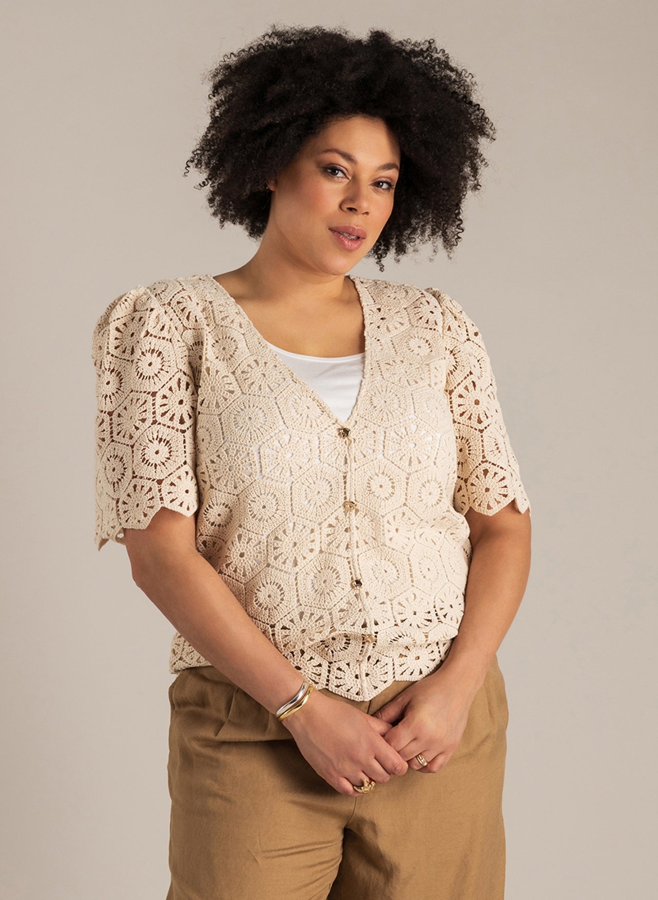 Die Strickbluse „Ninia“ von Yest Curve überzeugt mit modernem Design und luftigem Look. Leicht goldene Knöpfe und feminine Puffärmel setzen stilvolle Akzente und machen sie zum besonderen Hingucker für trendige Outfits.