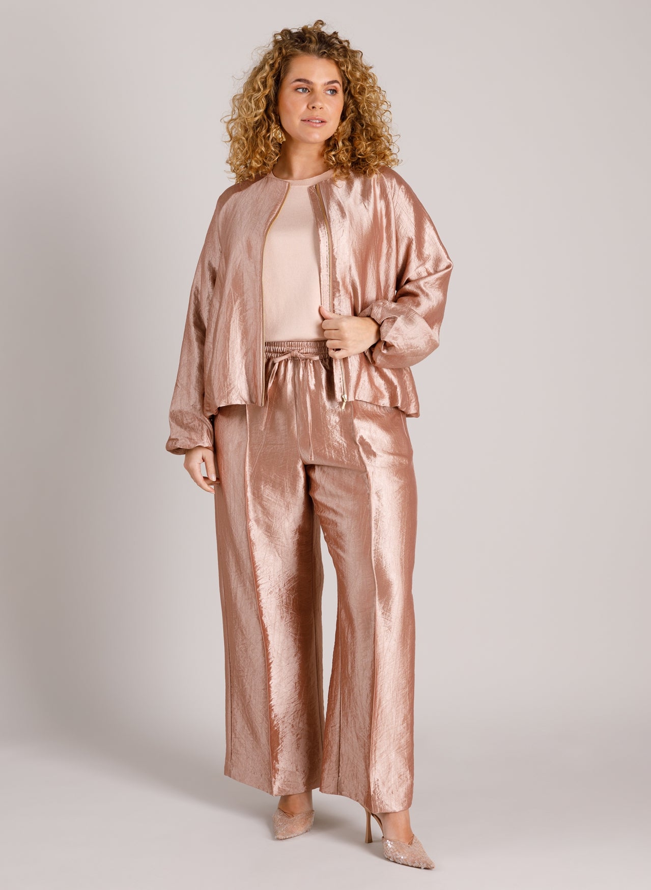 Die Hose „Liv“ von Yest Curve überzeugt im gleichen schimmernden Rosé-Design wie die passende Jacke und sorgt für einen rundum stimmigen Look. Modern geschnitten und vielseitig kombinierbar ist sie ein echtes Fashion-Statement – perfekt als Set oder solo getragen.