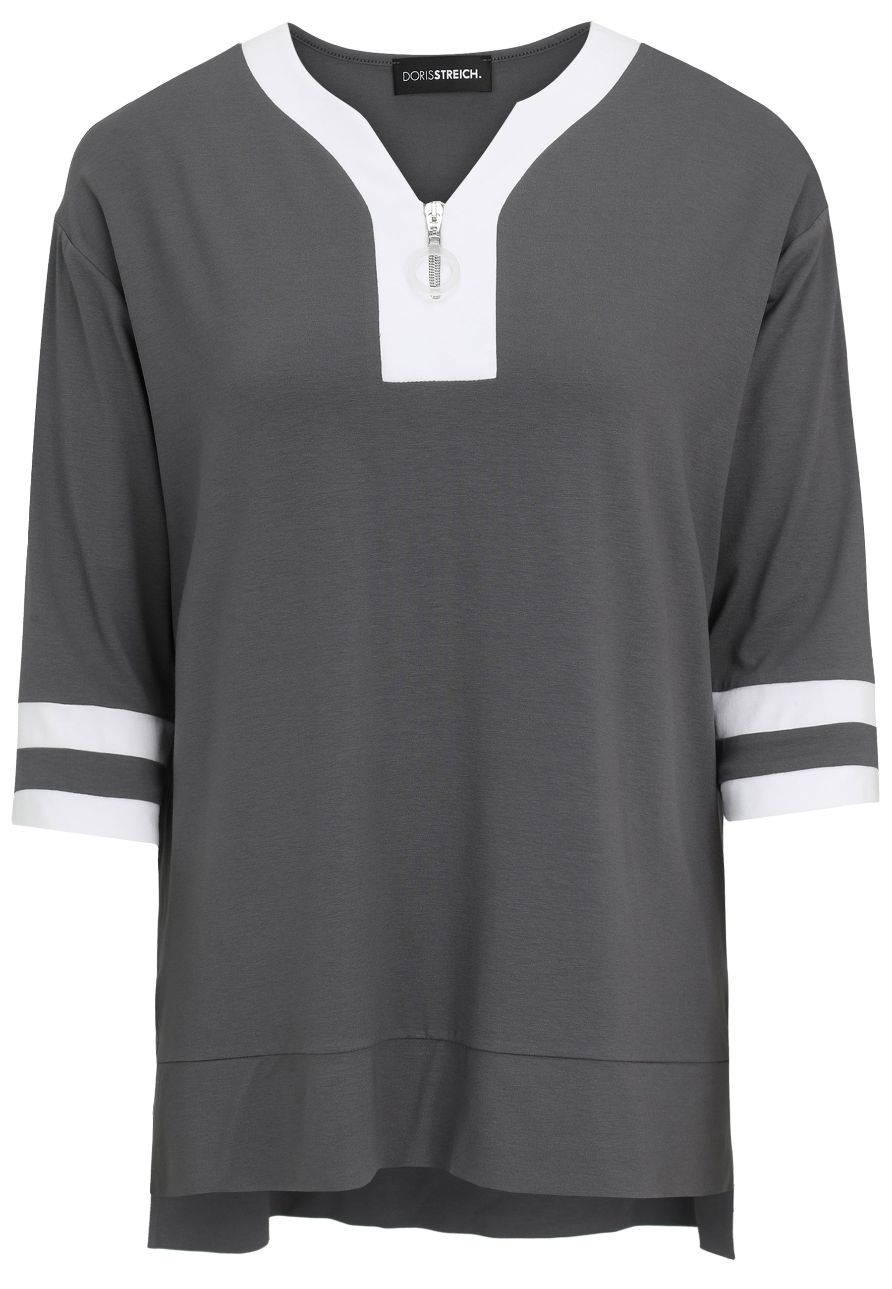 Das cleane Long-Shirt von Doris Streich ist aus softem elastischem Material gefertigt. Die angesagte High-Low-Form mit verlängerter Rückenpartie unterstreicht den lässigen Look. Das 3/4-Arm Shirt punktet mit hohem Tragekomfort: Die weiche elastische Materialmischung fällt leger. Der dekorative weiße Einsatz rund um den Halsausschnitt, der Reißverschluss mit dekorativem Anhänger und die Einsätze am Ärmelabschluss macht diesen Style zum neuen Lieblingsteil Ihrer Garderobe.