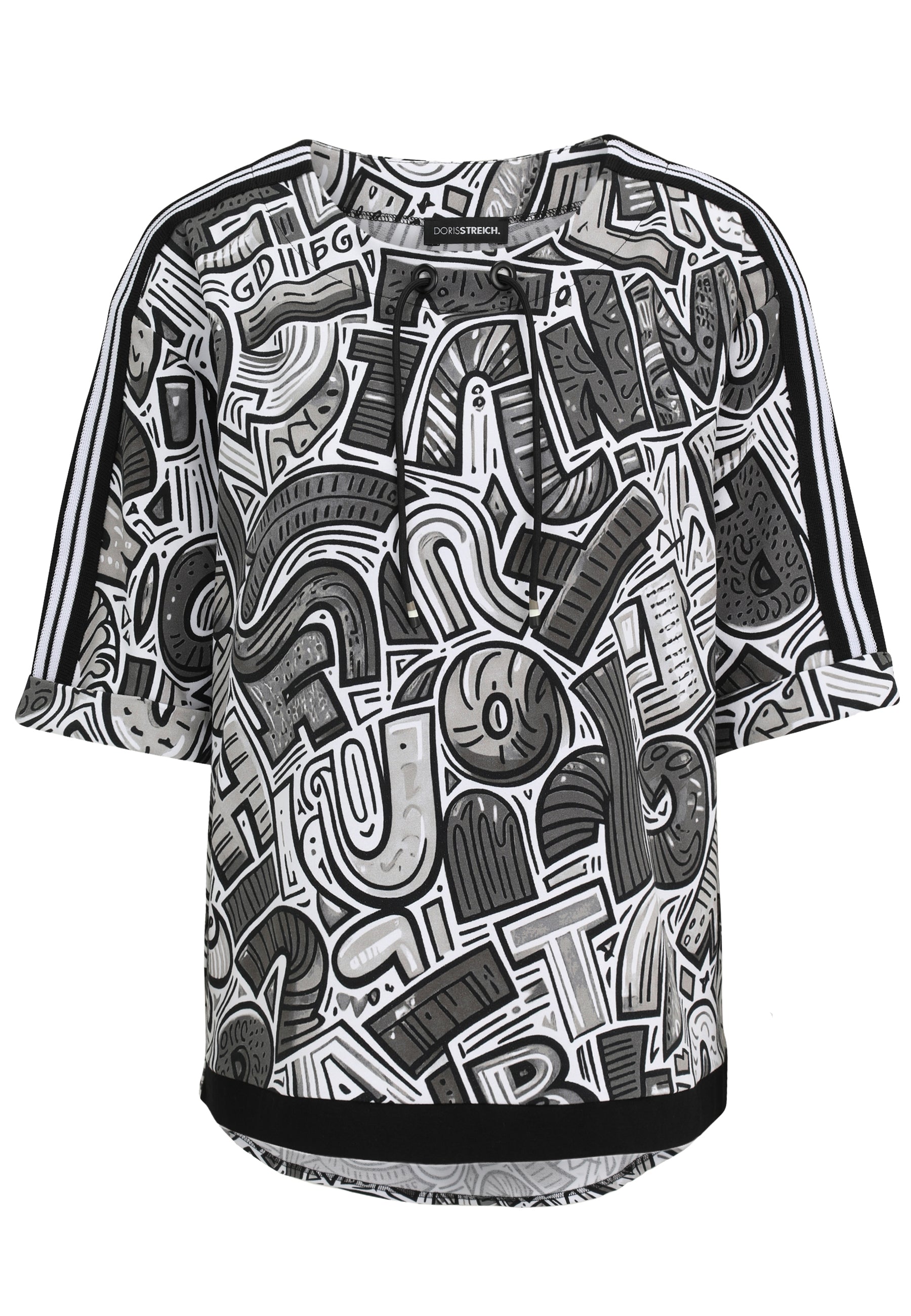 Das Sweatshirt von Doris Streich ist aus softer leichter elastischer Sweatware gefertigt. Der cleane Comic-Buchstaben-Print, das Streifenband auf Schultern und Ärmeln, die Kordel mit dekorativ gestreiften Kordelenden, die angesagte High-Low-Form mit verlängerter Rückenpartie machen dieses Sweatie mit langem Halbarm zu Ihrem neuen Lieblingsteil. Alloverprint, nicht platziert - jedes Teil ein Unikat.
