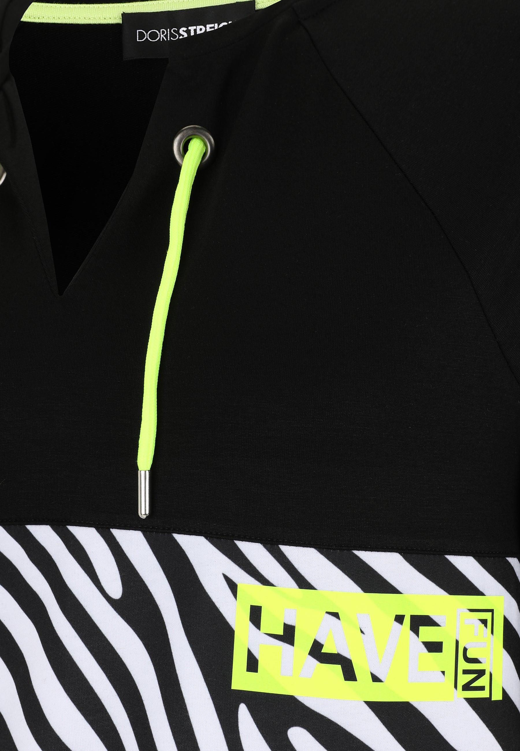 Das Sweatshirt von Doris Streich ist aus softer elastischer Sweatware gefertigt. Ein Frontprint mit weißem Zebra-Muster mit Wording HAVE FUN machen dieses Sweatie mit langem Halbarm zu Ihrem neuen Lieblingsteil. Zwei Ösen mit dekorativen Kordeln und der lange Halbarm runden den lässigen Style ab.
