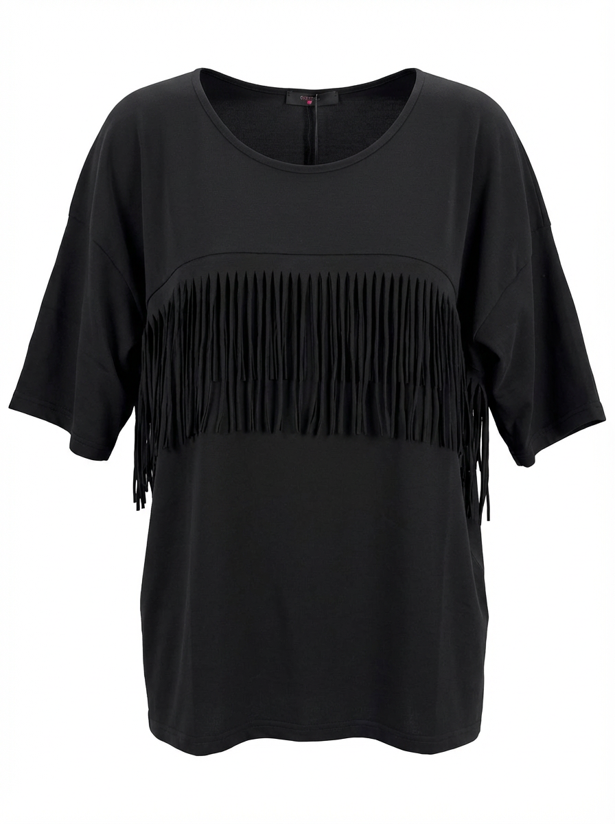 Dieses T-Shirt von Sophia Curvy besticht durch seinen modernen Fransen-Look und schmeichelt jeder Figur. Die lockere Passform bietet maximalen Tragekomfort für deinen Alltag.