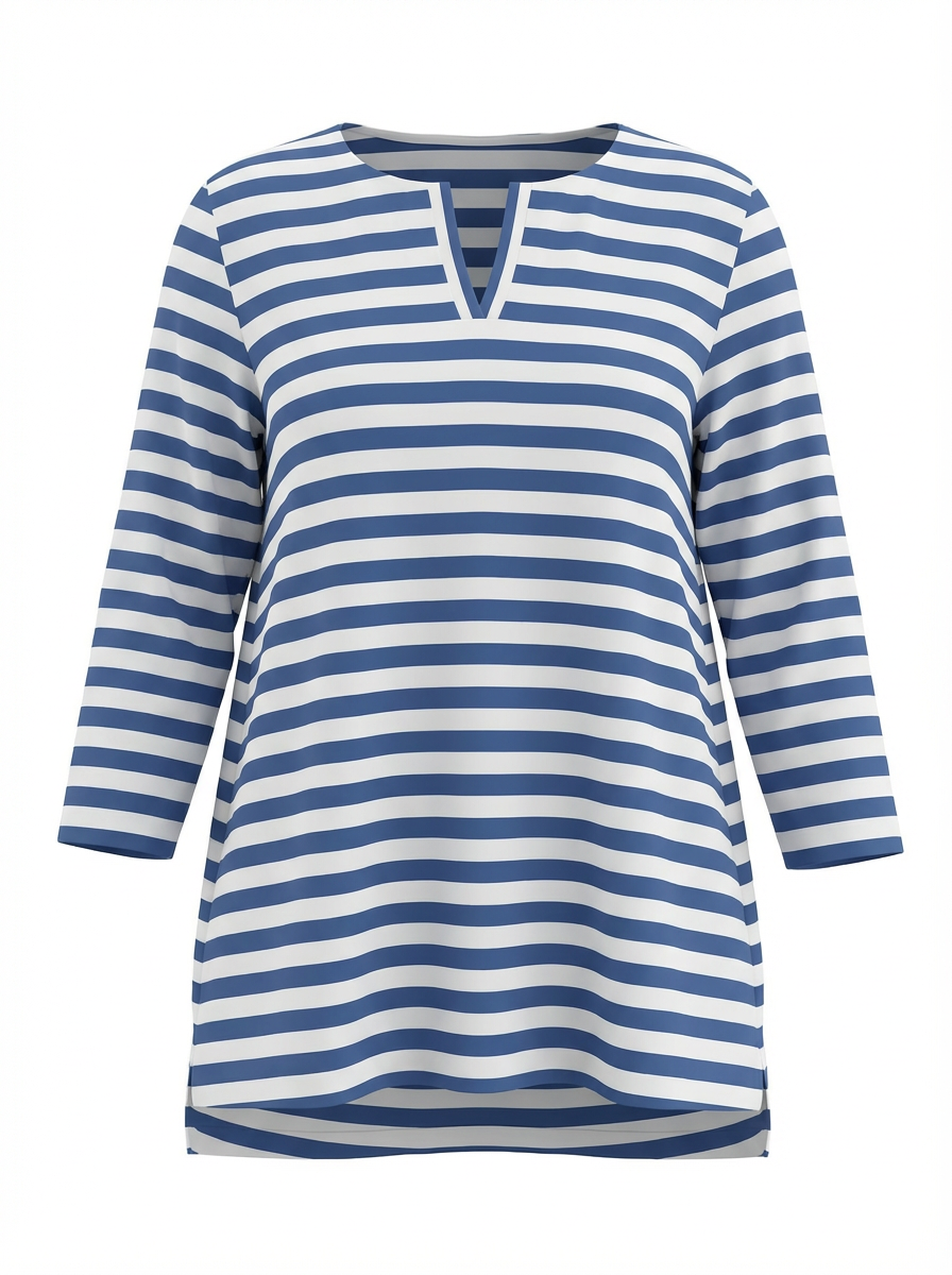 Elegante gestreifte Tunika von Vetono in strahlendem Himmelblau. Das zeitlose Streifenmuster verleiht dieser Tunika einen klassischen Charme, während die luftige Farbe perfekt für jeden Anlass geeignet ist. Vielseitig kombinierbar und angenehm zu tragen – ein Must-have für deinen Kleiderschrank.